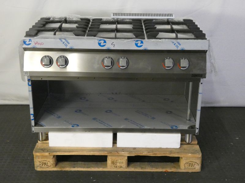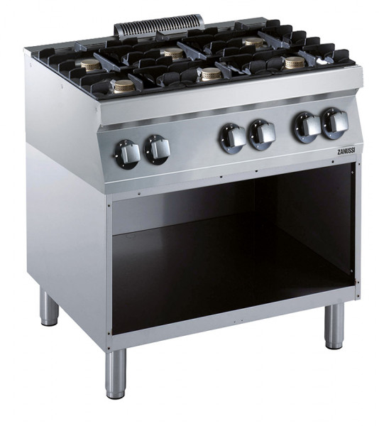 - Pilot-Zündflamme, Zündsicherung je Brenner, Kontrollflamme je Brenner, Kochstellen-Abstellgitter aus emailliertem Gusseisen, 4-Takt-Schalter je Heizzone