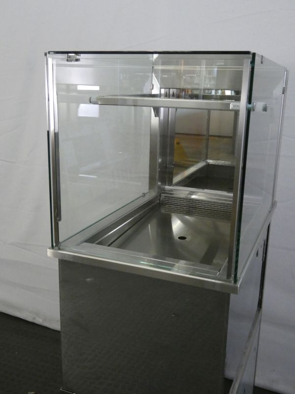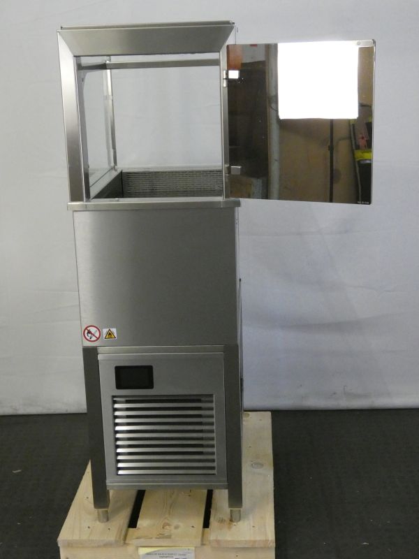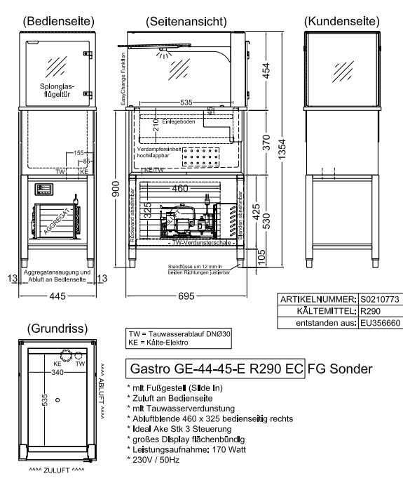 steckerfertig, mit Fußgestell (Slide In), Zuluft an Bedienseite, mit Tauwasserverdunstung, Abluftblende 460 x 325 bedienseitig rechts, Ideal Ake Stk 3 Steuerung, großes Display flächenbündig, Glasaufbau: eckige Ausführung mit Normalverglasung; komplett Edelstahl, alle Sichtseiten geschliffen; Innenwanne dicht verschweißt in Hygieneausführung; Isolierung in Polyurethan-Hartschaum (druckgeschäumt); beschichteter Lamellenverdampfer mit Umluft - zum Reinigen hochklappbar; drehzahlgeregelte Lüfter in Niederspannung; Elektronikregelung mit digitaler Temperaturanzeige; vollautomatische Abtauung; tiefgezogener Tauwasserablauf HD 30; Innenbeleuchtun, je Etage; reinigungsfreundlicher Glasaufbau; Bedienseite: Flügeltür in Spionspiegel (abnehmbar, Türanschlag echts); Kundenseite: Frontglas mit Easy-Change-System (wahlweise offener oder geschlossener Betrieb möglich); geeignet für 1 x GN 1/1; Bestückung der Wanne mit maximaler Schalenhöhe bis 150 mm möglich; Innenwannentasse herausnehmbar; Einlegeboden höhenverstellbar; zum Einhängen mit Einhängerand; zwangsbelüftetes Kälteaggregat untergebaut - im FG Sonder mit Tauwasserverdunstung;