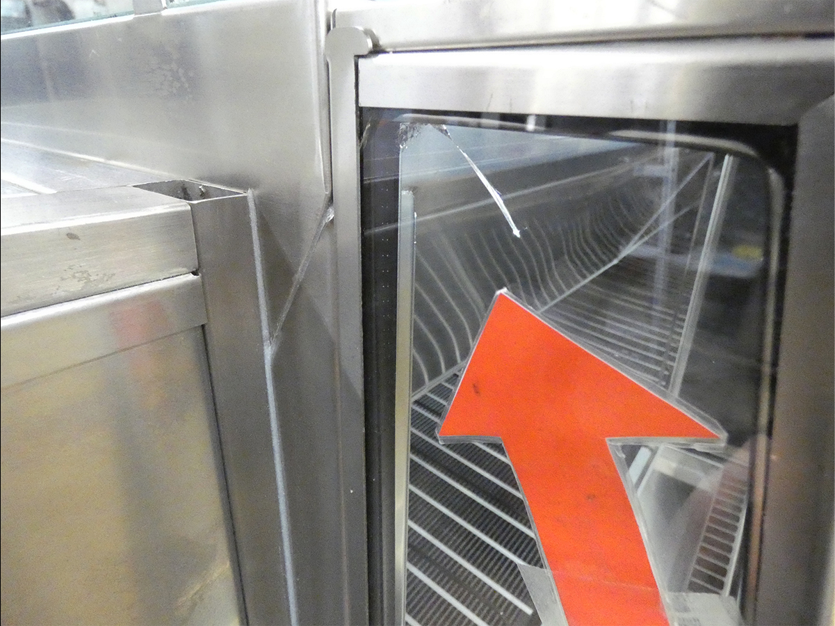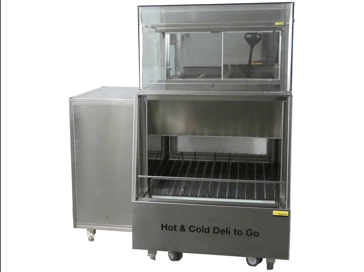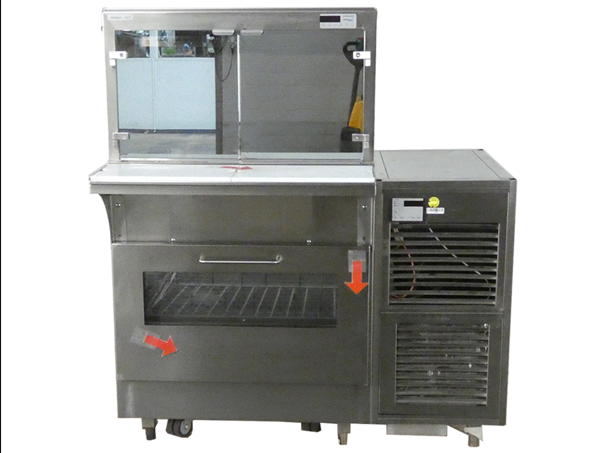 Kombinationsvitrine - Sonderbau, komplett Chromnickelstahl 1.4301, alle Sichtseiten geschliffen, Isolierung: Polyurethan Hartschaum, zwangsbelüftetes Aggregat im Aggregatsfach montiert, inkl. Stellfüße mit Sockelblenden und Lenk- und Fixierrollen (fahrbar), Be- und Entlüftung an Bedienseite; Maschinenfach rechts angebaut an Bedienseite;