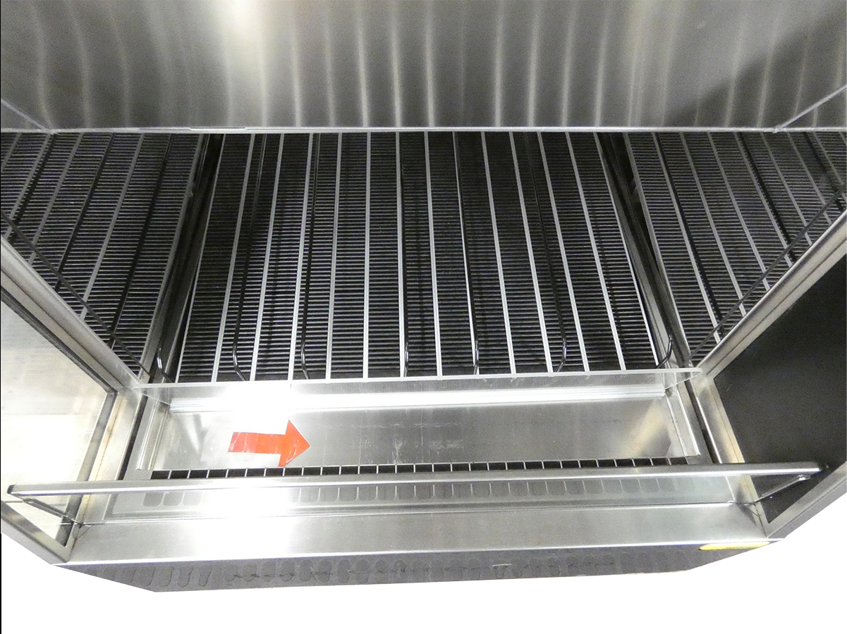 beschichteter Lamellenverdampfer mit Umluft - hochklappbar, Lüfter in Niederspannung, Bedienseite: Ladenauszug mit Rollenrutschsystem, Kundenseite: offen - Grab & Go für Flaschen, Beleuchtung mit LED, vollautomatische Abtauung und Tauwasserverdunstung, Elektronikregelung mit digitaler Temperaturanzeige;