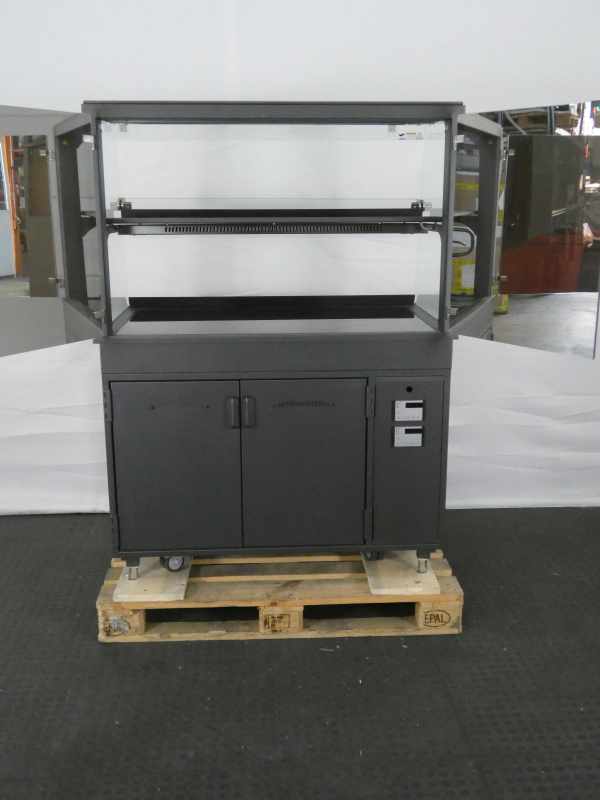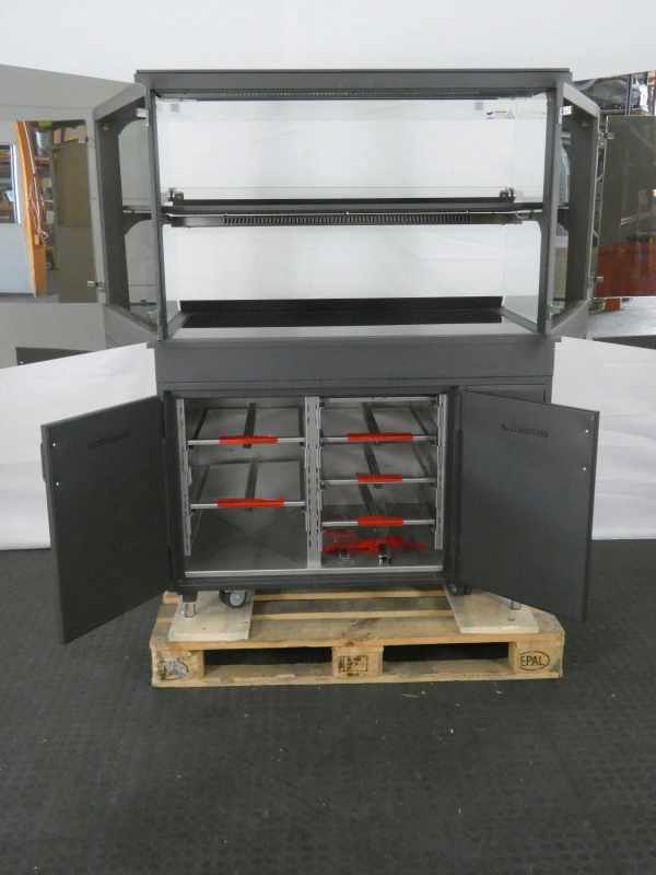 Kombinationsvitrine mit trockener Wärme, SlideIn Modell!, Glasaufbau: 10° schräge Ausführung mit Normalverglasung; komplett Edelstahl, alle Sichtseiten geschliffen; Isolierung in Polyurethan-Hartschaum (druckgeschäumt); Heizplatte (Primärwärme) an beiden Ausstellflächen; Wärmebrücke (Stützwärme) inkl. hitzebeständiger Beleuchtung; Ausstellfläche in Schwarzglas; Elektronikregelung mit digitaler Temperaturanzeige; Bedienseite: Flügeltüren in Spionspiegel; Kundenseite: offen; geeignet für 3 x GN 1/1; 1 Schwarzglaszwischenbord; mit Einbaurahmen; Wärmeunterbau Hot Storage mit 2 Flügeltüren für GN 1/1 für Speisenbevorratung; mit 1 Spuckschutz (auf Seitenscheiben montiert), Preisschildhalter an beiden Ebenen, Unterbau: Hot-Storage Sonder, mit Stellfüßen inkl. Lenk-und Fixierrollen (fahrbar), PULVERBESCHICHTET: alle Sichtteile (komplett) in DP703FS, Produkttemperatur: > +65°C, VITRINE: Anschluss: 2050 W - 230V/50Hz, HOT STORAGE: Anschluss: 1320 W - 230V/50Hz, ABM.: (BxTxH) 1125 x 695 x 1515 mm