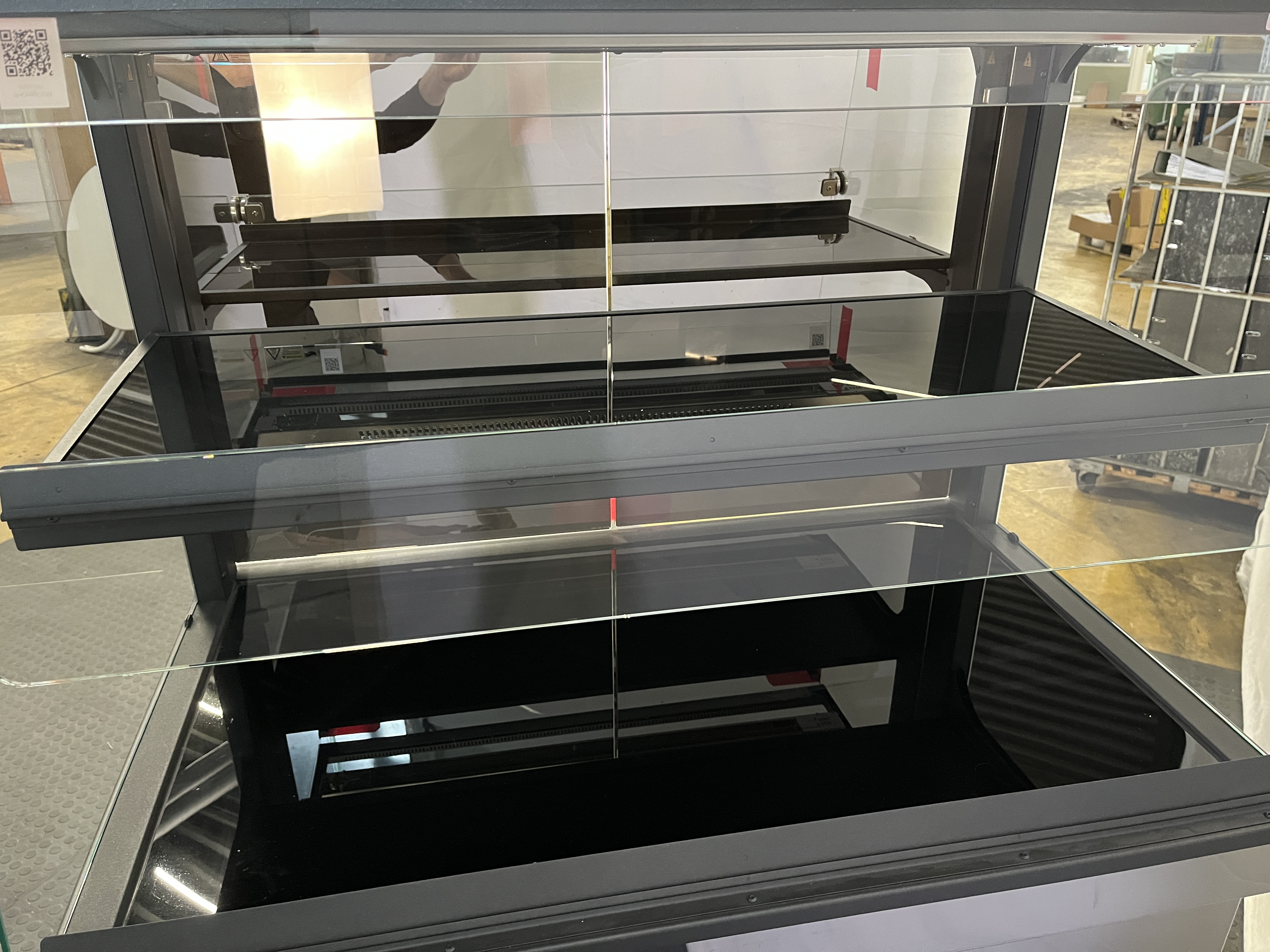 Kombinationsvitrine mit trockener Wärme, SlideIn Modell!, Glasaufbau: 10° schräge Ausführung mit Normalverglasung; komplett Edelstahl, alle Sichtseiten geschliffen; Isolierung in Polyurethan-Hartschaum (druckgeschäumt); Heizplatte (Primärwärme) an beiden Ausstellflächen; Wärmebrücke (Stützwärme) inkl. hitzebeständiger Beleuchtung; Ausstellfläche in Schwarzglas; Elektronikregelung mit digitaler Temperaturanzeige; Bedienseite: Flügeltüren in Spionspiegel; Kundenseite: offen; geeignet für 3 x GN 1/1; 1 Schwarzglaszwischenbord; mit Einbaurahmen; Wärmeunterbau Hot Storage mit 2 Flügeltüren für GN 1/1 für Speisenbevorratung; mit 1 Spuckschutz (auf Seitenscheiben montiert), Preisschildhalter an beiden Ebenen, Unterbau: Hot-Storage Sonder, mit Stellfüßen inkl. Lenk-und Fixierrollen (fahrbar), PULVERBESCHICHTET: alle Sichtteile (komplett) in DP703FS, Produkttemperatur: > +65°C, VITRINE: Anschluss: 2050 W - 230V/50Hz, HOT STORAGE: Anschluss: 1320 W - 230V/50Hz, ABM.: (BxTxH) 1125 x 695 x 1515 mm